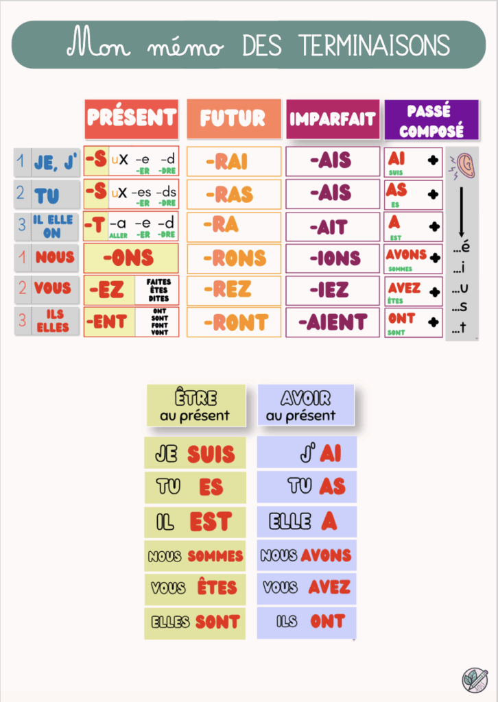 - Le présent : j’ai décidé de mettre en avant les terminaisons régulières (avec un carré jaune). J’ai ajouté les terminaisons pour les verbes en -dre avec je et tu (je me suis fait avoir un paquet de fois avec les “je prens” dans les cahiers !). J’ai remplacé le -nt par -ent. Ce “-nt” était vraiment incompris par mes élèves et seuls quatre verbes se terminent par -ont.