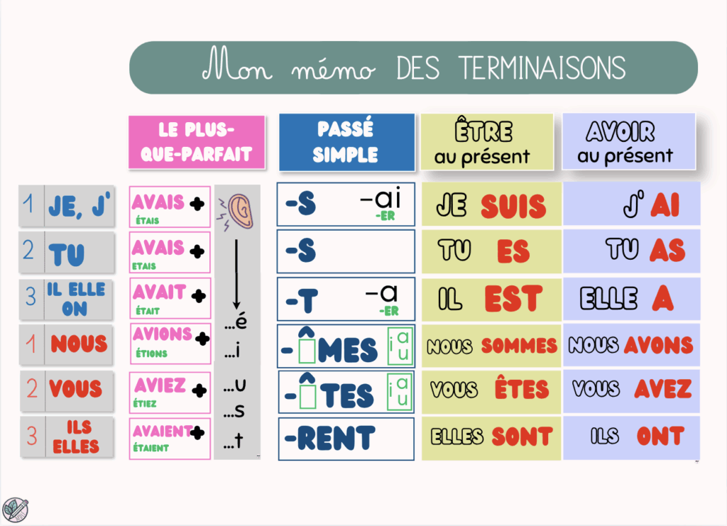 - Ajout de temps : il était enfin temps de préparer le plus-que-parfait. De plus, j’ai ajouté les verbes être et avoir au présent. Mes CE2 en ont vraiment besoin. Ils rejoignent officiellement le mur des terminaisons de la classe !