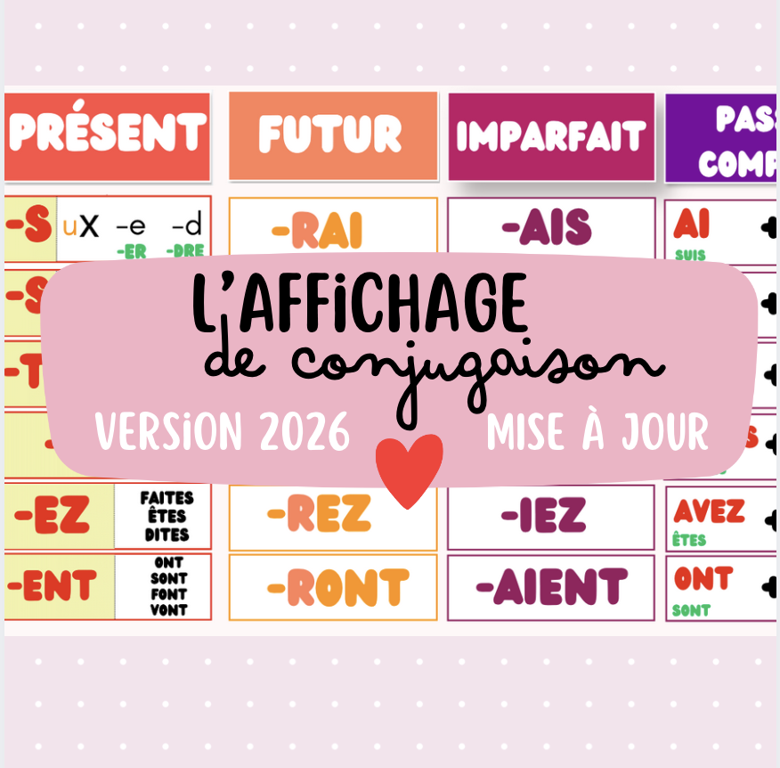 Après des années d’utilisation, avec plusieurs cohortes d’élèves, je n’étais pas entièrement satisfaite de mon affichage. Cet affichage de conjugaison est un indispensable dans ma classe : mes élèves s’y réfèrent quotidiennement. Je le laisse toute l’année, je ne le supprime jamais. Les élèves de CE2 qui rejoignent ma classe apprennent à s’en saisir avec l’aide des plus grands.