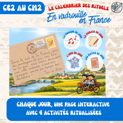 Après le succès des 2 premiers calendriers des rituels, mes élèves et moi ne pouvons plus nous en passer ! Ils adorent commencer la journée toute en douceur et moi, gagner du temps dans mes préparations ! J’ai donc décidé de leur proposer une nouvelle aventure pour cette dernière période ! Venez suivre Tom & Nina en vadrouille en France !